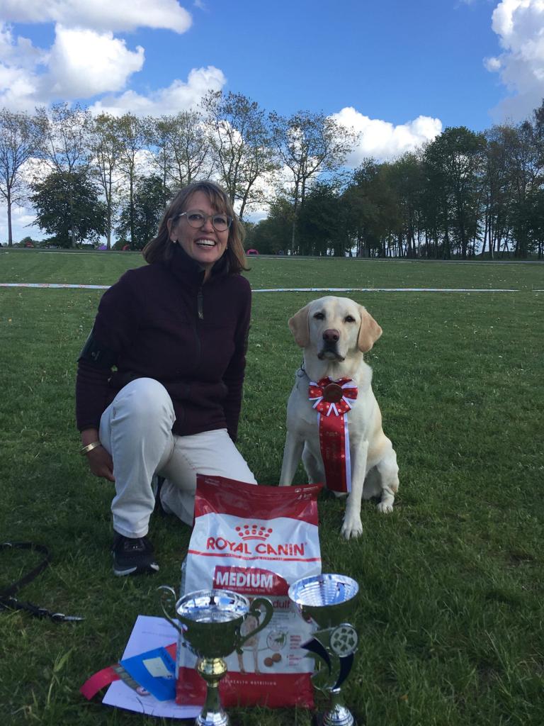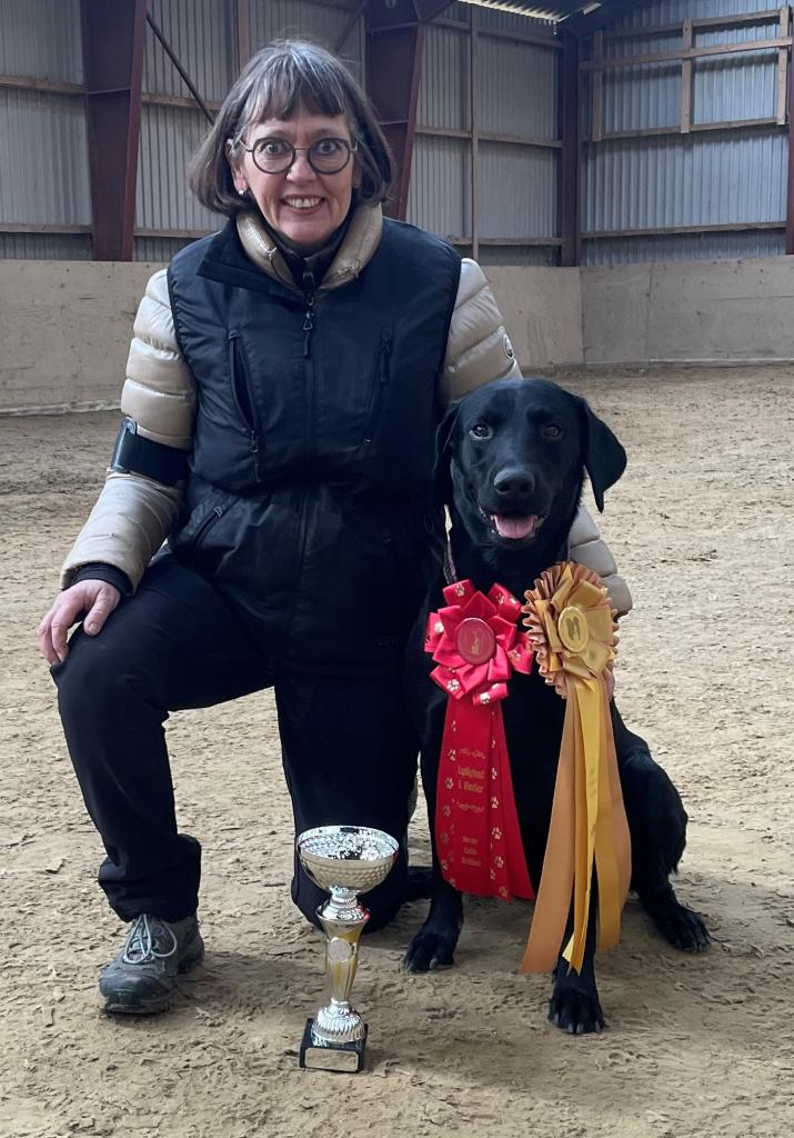Ms. Helle Voigt and Ravensbank Mint (Minte) as the best dog of the day in novice class at unofficial cold game test.